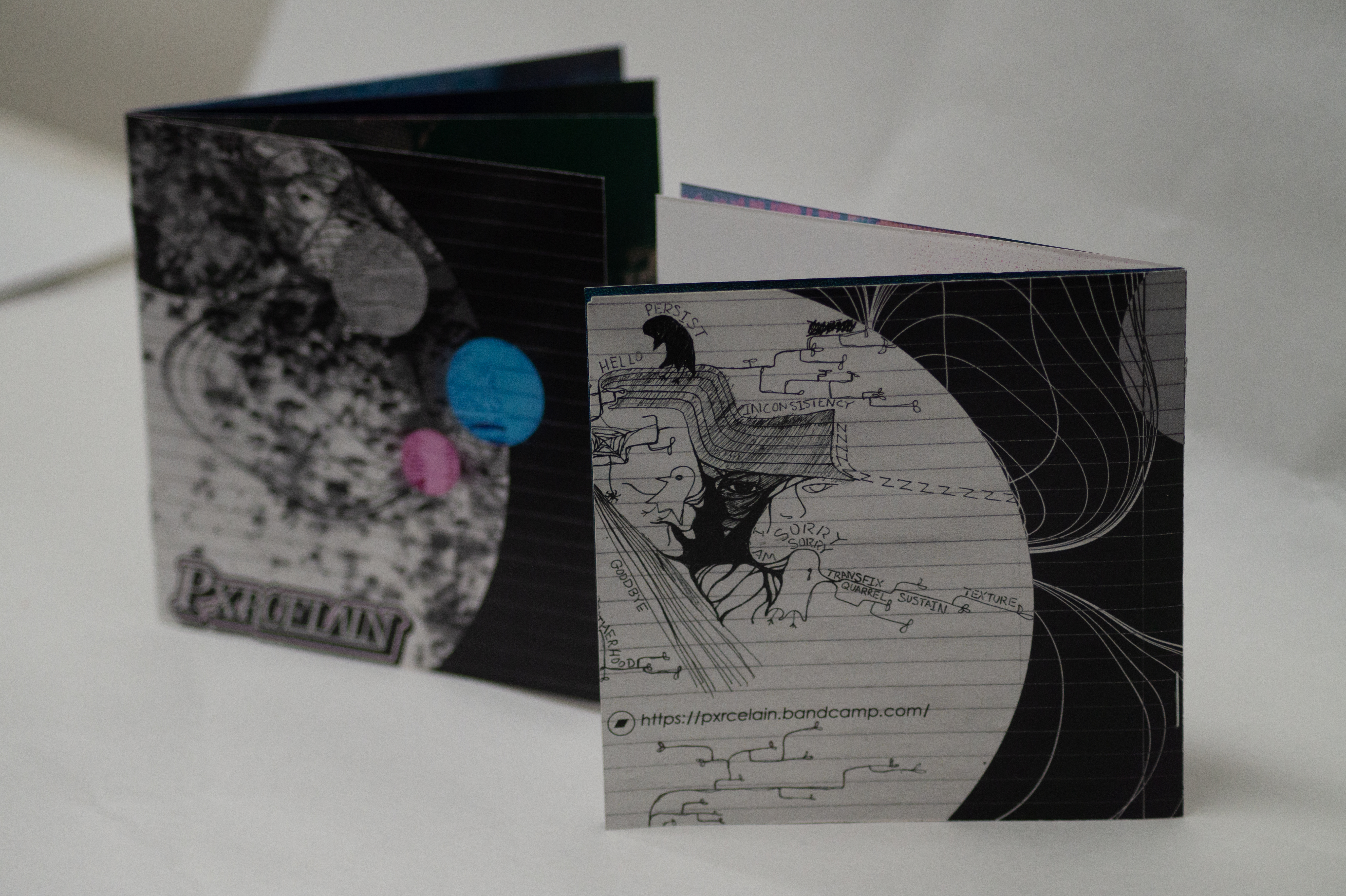 PXRCELAIN is an EP serving as the foundation for the visual design of my personal music career, as well as an exercise in graphic design for CD packaging. I am graphic designer, but also an audio designer, musician, and artist. With all of my interests being deeply interwoven I have fused them all into a single project. I’m heavily inspired by breakcore artists such as Goreshit and Venetian Snares, and the visual aesthetics of the early 00s and internet culture. Like a music producer may use samples to turn pre existing audio into new soundscapes, I use a wide collection of imagery within my design work. Usually through collecting scans of my own drawings, magazines, and other found media, I create dense and grungy digital collages with deep textures. PXRCELAIN contains a mix of ambient and breakcore tracks that make use of wide, dreamy, lush synth pads, and fast and spastic drum breaks. My music is my outlet and this EP focuses on just one of the genres and styles of music production that I find fascinating. With time I will explore a much wider range of sounds and styles, but for now. I aim to find a place within a small community online and to further hone my design skills for use in the music industry.